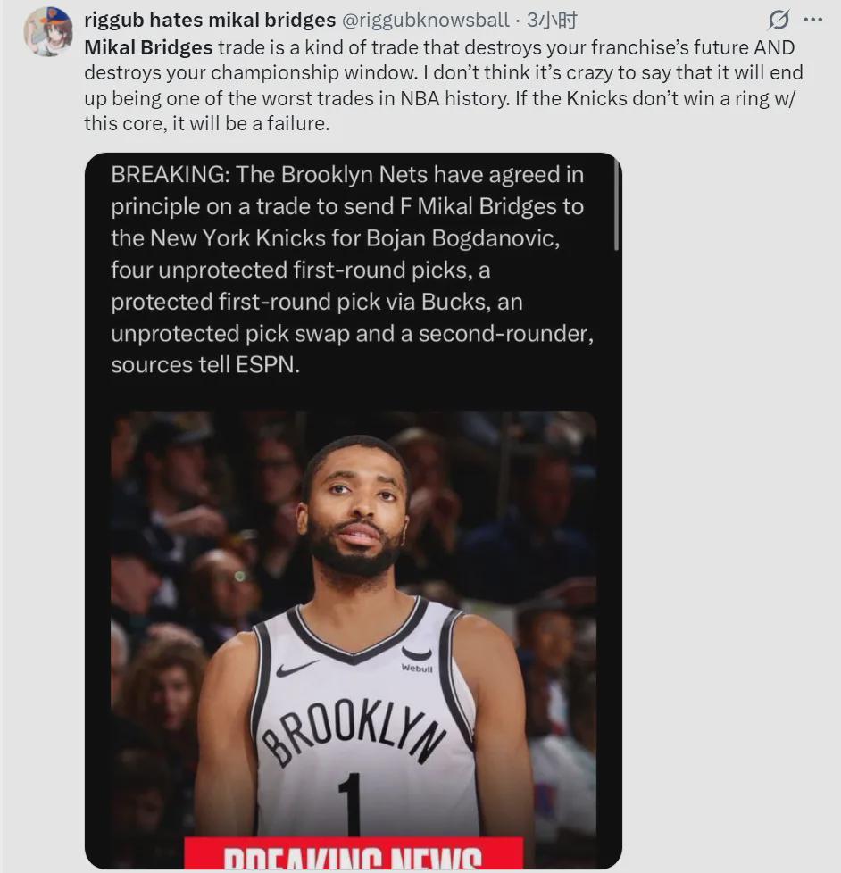 今天有尼克斯球迷在网上开喷:“布里奇斯的交易不仅会毁掉球队的未来,还会彻底断送球队的夺冠窗口期。毫不夸张地说,如果尼克斯最终没能用这套核心阵容赢得总冠军,当初那笔交易最终会成为NBA历史上最糟糕的交易之一。”